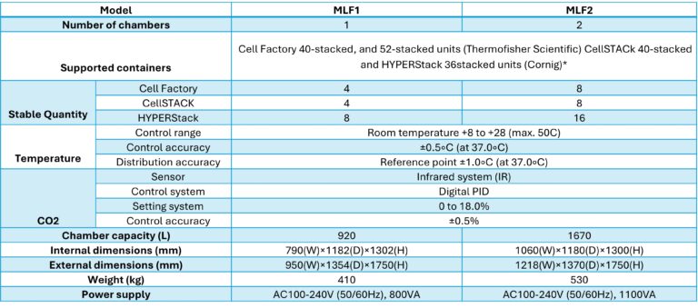 The MaxCell MLF (Multi Layer Flask) is the large capacity incubator optimized for Cell Factory (Thermofisher), or CellSTACK (Corning) or HYPERStack (Corning) flasks used for large scale cell, virus, protein and exosome productions. The flasks are firmly held in the special carrier in the incubator. The forcibly gas infusion model is available. It supplies CO2 gas into multi-layer flasks so that CO2 concentration and, eventually, pH value in each layer is kept stable. Gas hose connections are convenient and easy to make.